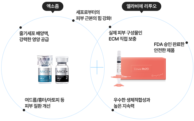 탑티어 피부 물광 프로그램은 줄기세포 배양액인 엑소좀과 ECM 부스터 엘라비에 리투오를 조합하여